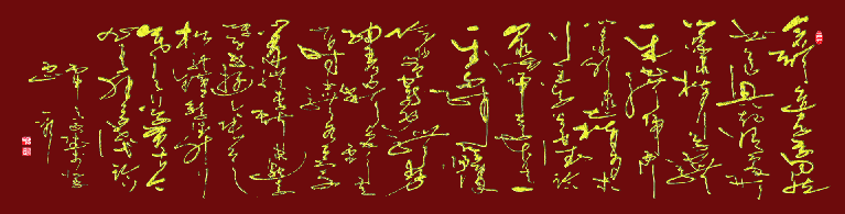 大狂草的一生二,是书法的一条自然线一分为二产生了阴线和阳线。阴阳之线在大狂草中的表现形式,主要有刚线柔线、实线虚线、粗线细线、长线短线、直线曲线、正线斜线、浓线淡线、燥线湿线等等,阴阳之线贯穿着书法之道,联通着大自然;